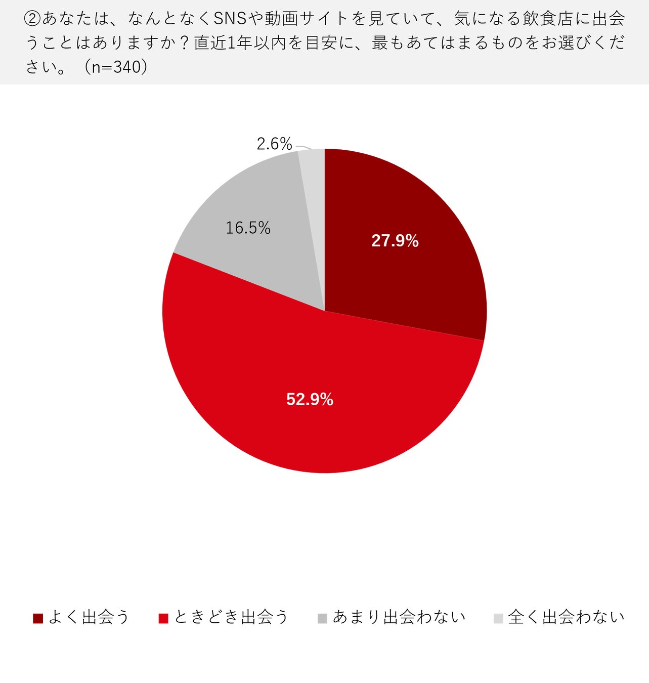 前問でSNSや動画サイトのいずれかを選んだ方に、SNSや動画サイトをなんとなく見ている際に気になる飲食店に出会うことがあるかを聞きました。「よく出会う」「ときどき出会う」の合計は80.8%にのぼりました。