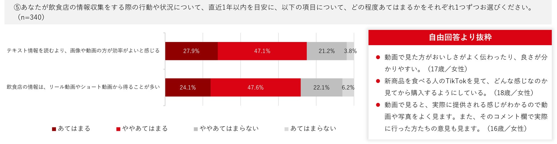 「テキスト情報を読むより、画像や動画の方が効率がよいと感じる」に対して、「あてはまる」「ややあてはまる」と回答した人の合計は75.0%でした。また「飲食店の情報は、リール動画やショート動画から得ることが多い」と回答した人は71.7%となり、飲食店の情報について、短尺動画を活用しながら効率よく情報収集している実態が浮かび上がりました。