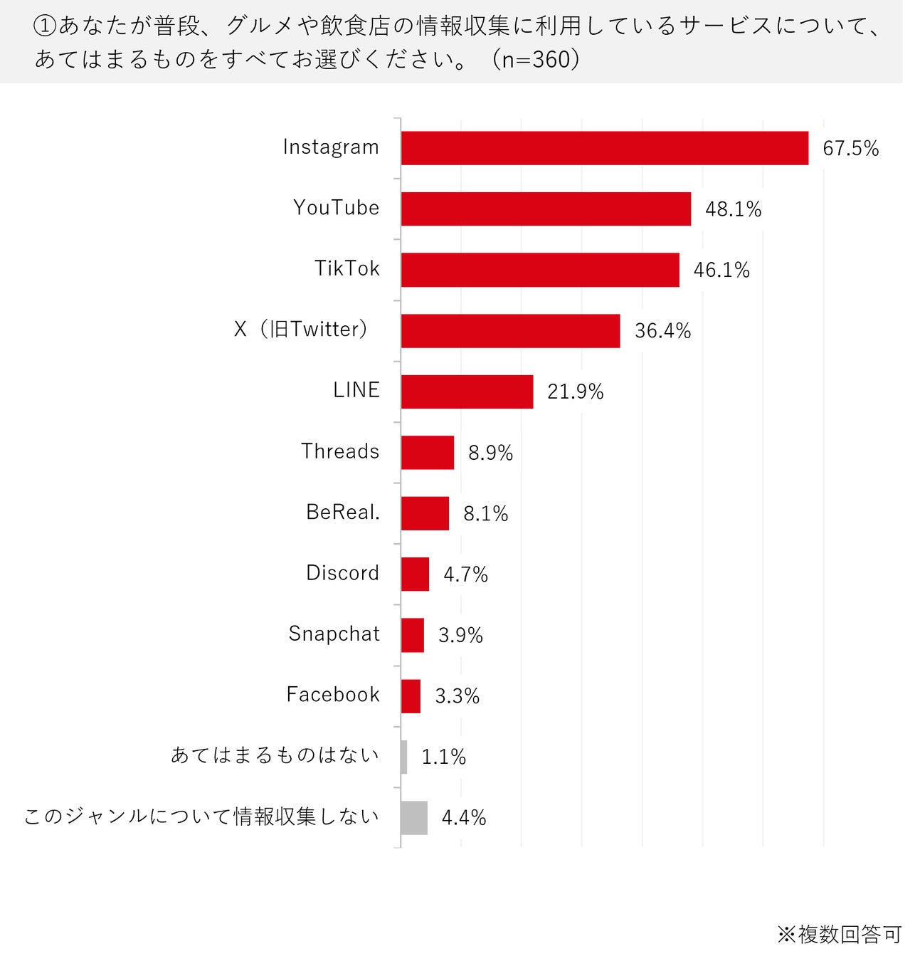 最多回答は「Instagram」の67.5%で、次いで「YouTube」が48.1%、「TikTok」が46.1%という結果になりました。グルメ・飲食店の情報収集源として、視覚的なSNSが活用されていることがわかります。