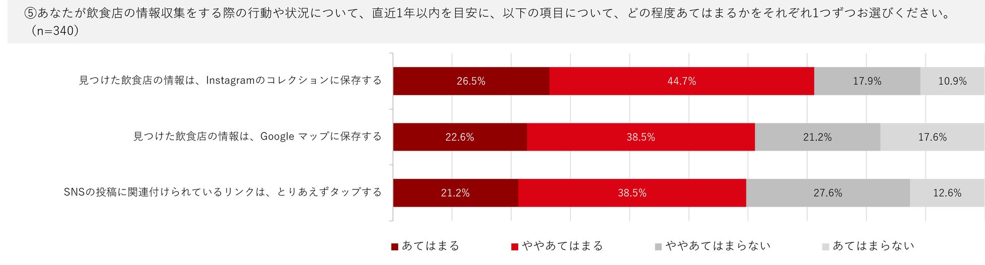 「見つけた飲食店の情報をInstagramのコレクションに保存する」について、「あてはまる」「ややあてはまる」と回答した人の合計は71.2%でした。また、「Google マップに保存する」人は61.1%という結果に。後で検討しやすいように、飲食店の情報をプラットフォームに保存しておくという行動が見られました。