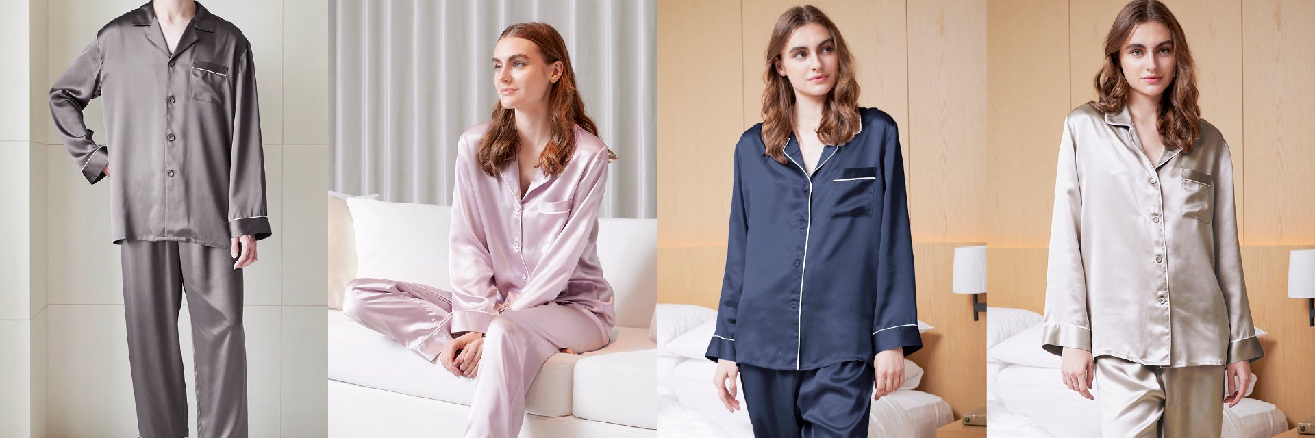 上質な眠りのために作られたシルク100%のナイトウェア。オーセンティックなシルエットのテーラードパジャマです。レディースはサンド、ネイビー、モーブピンクの3色展開。メンズはチャコールグレーとネイビーの2色展開です。