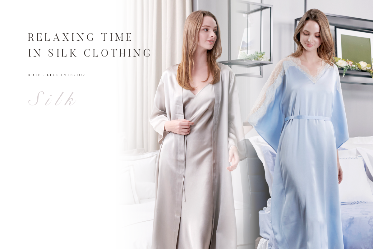 肌に直接触れるウェアだからこそ、ホテルライクインテリアは、最高のシルク素材をおすすめします。シルクは肌の成分に近い約20種類のアミノ酸で構成されており、肌と相性の良い天然素材です。肌へのストレスを最小限に抑え、温度や湿度を適切に保つ働きを果たします。