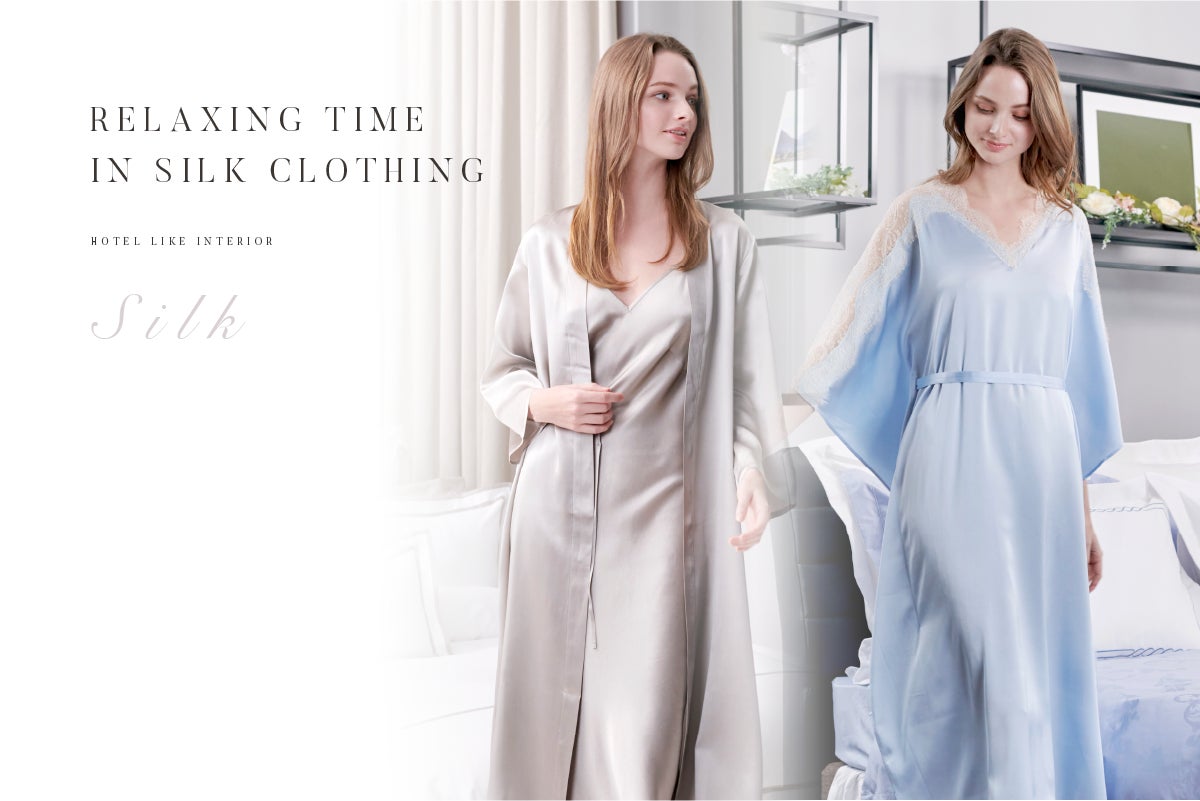 ご自宅でのリラックスタイムには勿論、旅先の特別な時間にも。やさしくとろけるようなシルク素材のラウンジウェアを、是非ご体感ください。