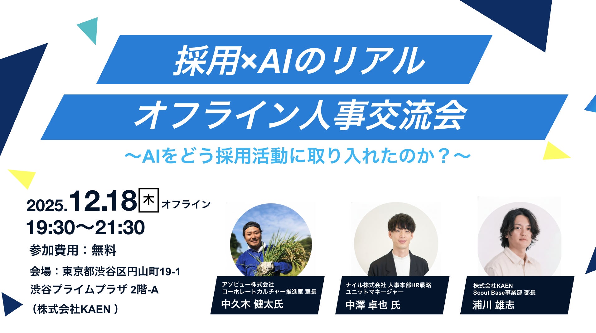 AI採用の「リアル」な実態に迫るオフラインイベントを開催します。 アソビュー株式会社、ナイル株式会社の採用責任者をお招きし、運用の裏側や失敗談まで本音で語っていただきます。建前なしで「本音」で語り合い、人事同士の横のつながりを作れる場ですので、ぜひお気軽にご参加ください。
