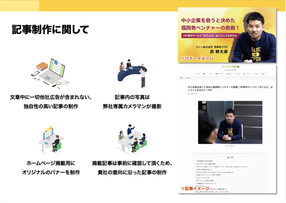 月間平均350万ページビューを誇るWEBメディア『ファンファン福岡(※1)』に企業の記事を掲載し、新商品やサービスのPRを行います。『ファンファン福岡』は地域のマスメディアも注目するWEBメディアです。新しく「企業カテゴリー」を設け、注目の企業として差別化を図った打ち出しが可能。また、WEBメディアへの掲載実績があることで、企業の信用度向上にもつなげることができます。セットプランとして、5分程度のPR動画制作も可能。掲載した記事をファンファン福岡が運営するSNSなどで拡散することもでき、効果的にPRすることができます。