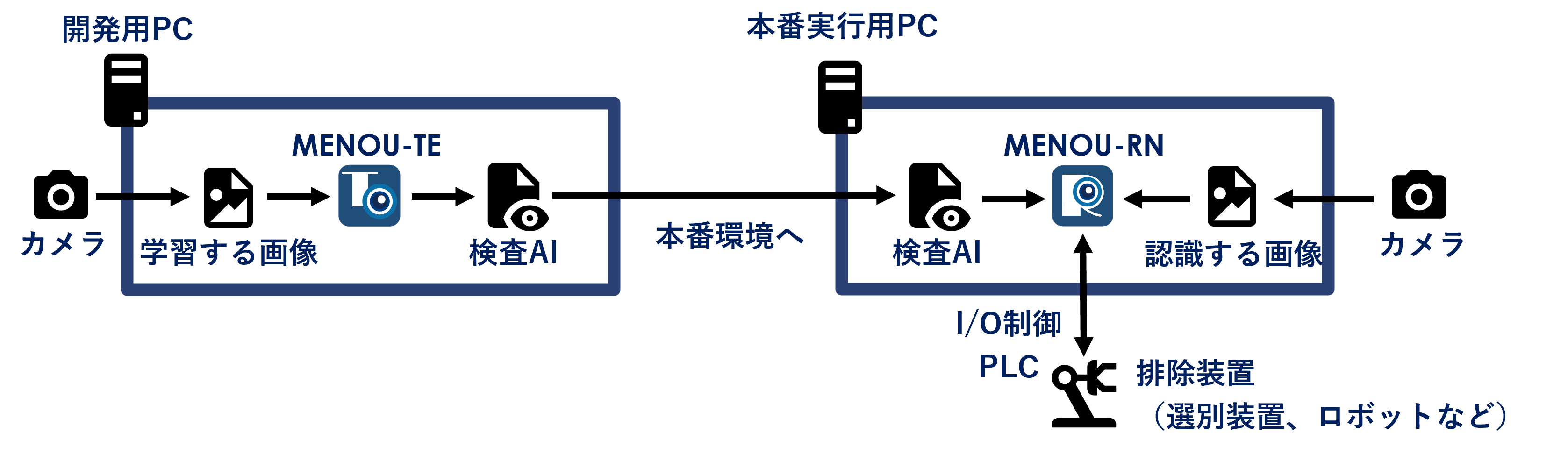 MENOUでは、目視検査の担当者がプログラミングやAIの専門知識を必要とせず、ノーコードで検査AIを開発できる環境を提供しています。今回のMENOU-RNにより、開発した検査AIをラインに導入する際に発生する搬送装置との連携ソフトウェアの開発や、データ連携のシステム開発を不要とし、開発したAIをそのまま実行することを可能にします。MENOUのAI開発プラットフォーム( https://menou.co.jp/menou-te/ )は開発から運用までをカバーし、ますます使いやすいAI開発環境を整えていきます。