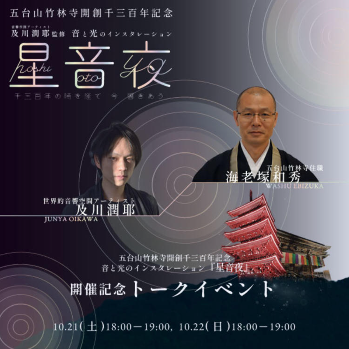 本イベントの開催を記念して高知 蔦屋書店にてトークイベントを開催します。竹林寺住職の海老塚和秀氏とサウンドアーティストの及川潤耶が登壇。両者の『星音夜』への想いから、「お寺 × アート」のコラボレーションの背景などについてお話します。二夜限りの特別な機会です。サウンドアートの体験もありますので、ぜひご参加ください。
