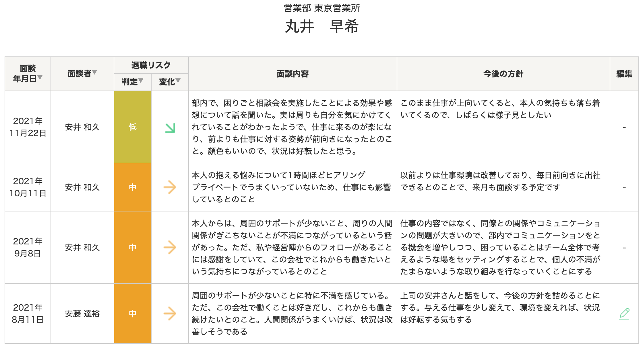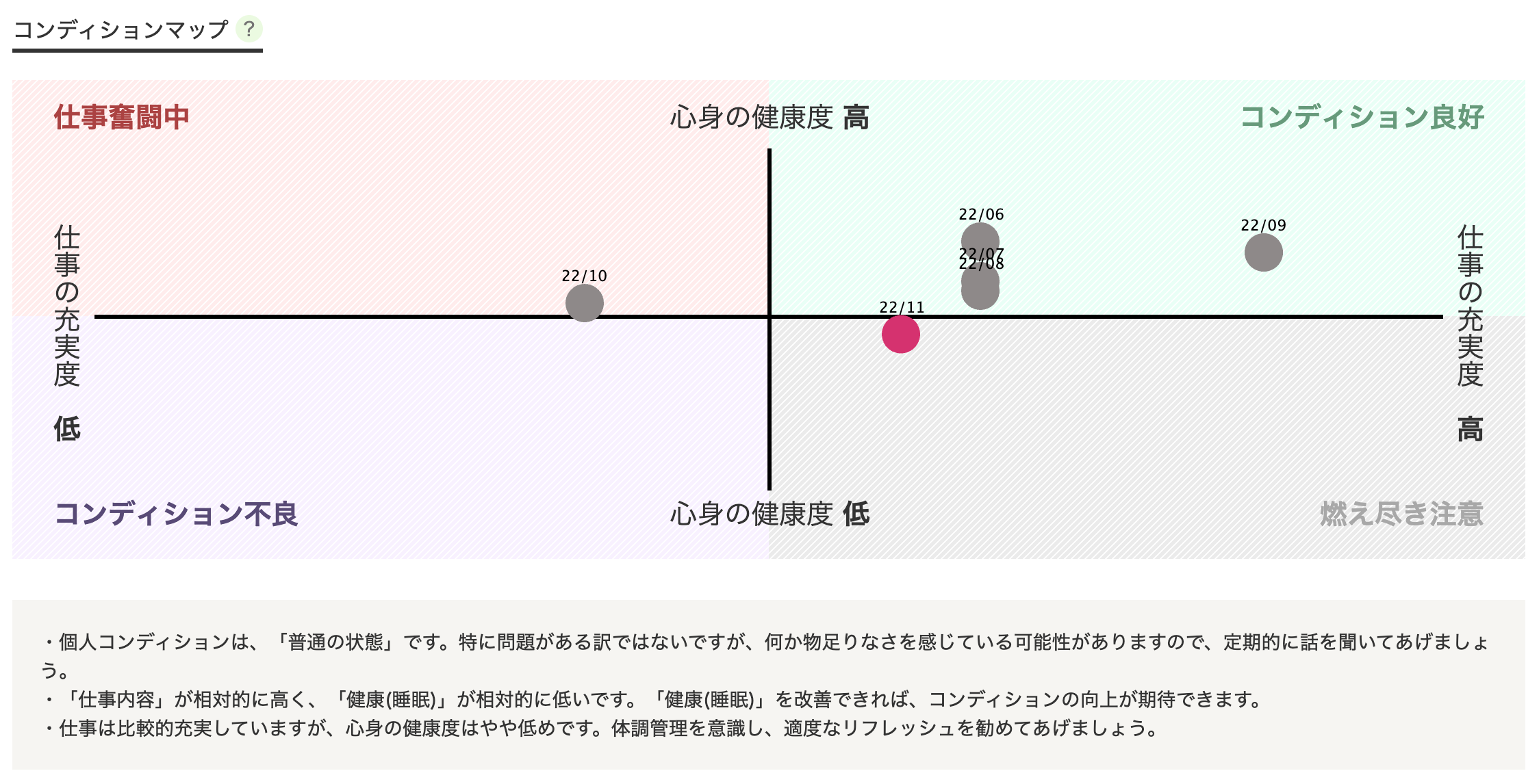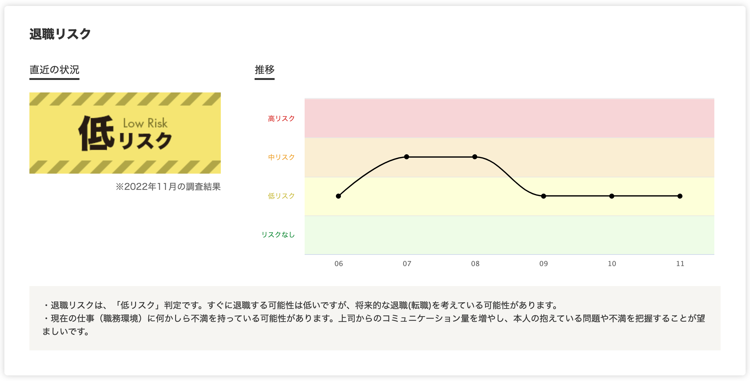 マネージャーは、部下の現在のコンディションが「コンディション良好」「燃え尽き注意」「仕事奮闘中」「コンディション不良」のどの状態か把握し、直近6ヶ月間の変化を確認できます。また、退職リスクがどの程度あるかも把握できるので、有望社員の離職予防に向けたフォローをタイムリーに行うことができるようになります。