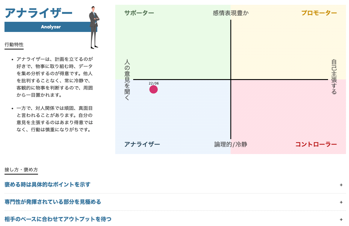パルスアイが、部下のコミュニケーションタイプを「コントローラー」「プロモーター」「サポーター」「アナライザー」の4タイプで診断し、上司がどのような接し方・褒め方をすると本人のやる気(モチベーションアップ)につながるかを助言します。これにより、マネージャーは部下のタイプに応じた効果的なコーチングを実践できるようになります。
