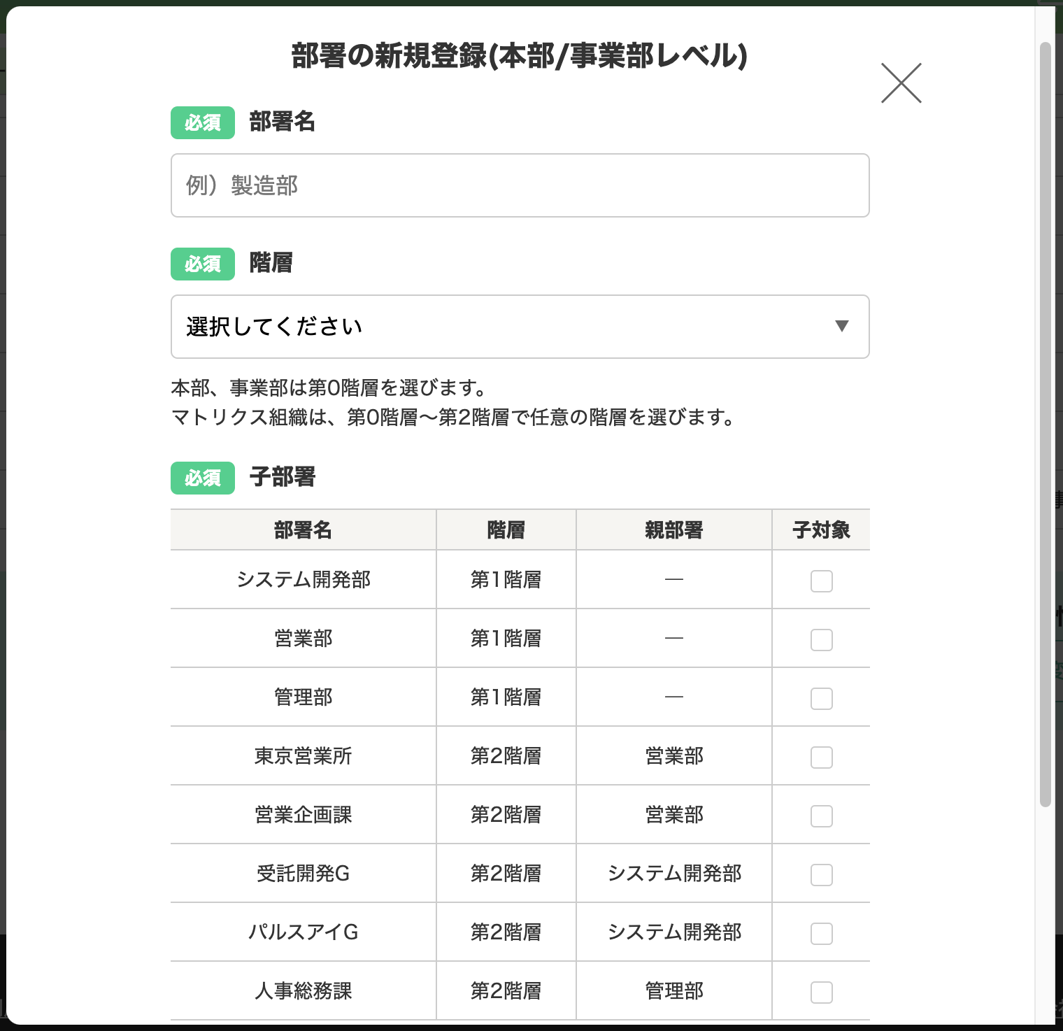 今までパルスアイでは、部レベルと課レベルの2階層の部署設定が可能でしたが、今回の機能リリースにより、事業部レベル(3階層)や事業本部レベル(4階層)といった多階層の部署設定が可能になりました。また、事業別組織と機能別組織を組み合わせたマトリクス組織の部署設定も可能になり、様々な組織形態に対応できるようになりました。