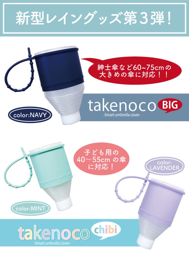 第3弾となる今回は、「パパの使っている傘が大きくて使えない!」「子ども用の傘カバーも欲しい!」という声を反映。よりたくさんの方にご利用いただけるよう、60〜75cmの紳士傘対応の傘カバー「takenoco BIG」40〜55cmの子ども傘対応の傘カバー「takenoco chibi」を開発しました。