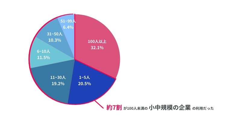 利用企業を従業員規模ごとに分類すると、従業員数100人未満の小〜中規模の利用が約7割を占めました。小規模企業でも業務効率化・クラウドツールへの関心が高まっていることがわかりました。