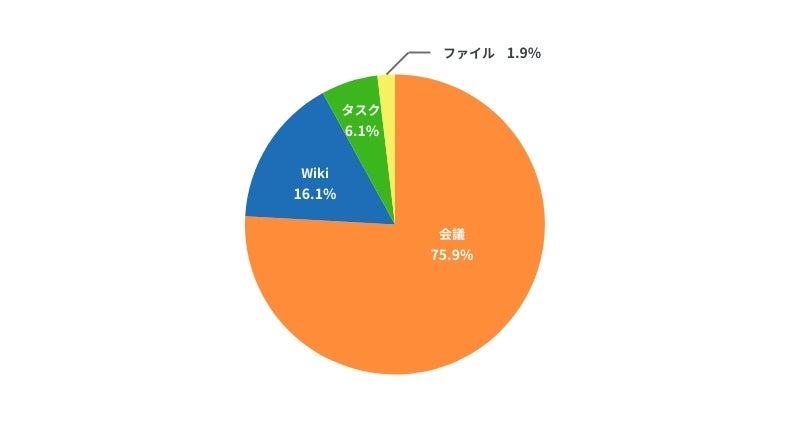Huddlerには「会議」「タスク」「wiki」「ファイル」の4つの機能が備わっていますが、一番利用率の高い機能は「会議」で、約75%の割合で利用されています。次いで「wiki」が20%程度となり、議事録機能で日々の打ち合わせ内容を記録し、ストックしたいマニュアルや業務に関わる情報などはwikiに蓄積するなど目的や用途にあわせて使い分けがされていることがわかりました。