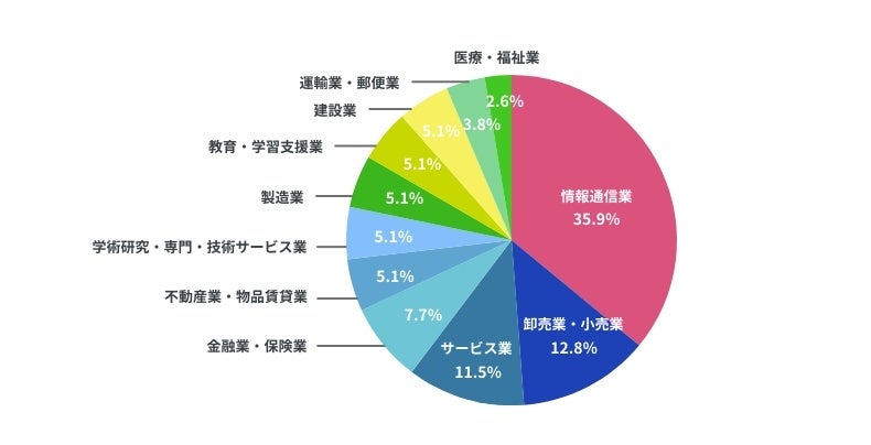 Huddlerを最も多く利用されている業種第1位は『情報通信業』の35.9%という結果になりました。第2位は『卸売業・小売業』の12.8%、第3位は『サービス業』の11.5%、第4位は『金融業・保険業』の7.7%の順に並び、特定の業種のみならず幅広い企業で利用されていることがわかりました。