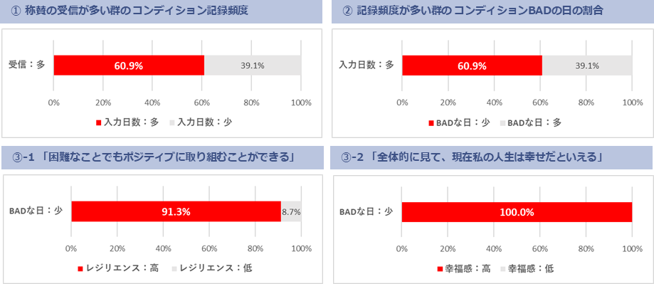 コンディション記録の提出があったユーザー46名の記録内容、同時期に受け取った『Peer-Trust』称賛メッセージの件数、事後に行った意識調査の回答を比較した結果、以下の傾向がわかりました。