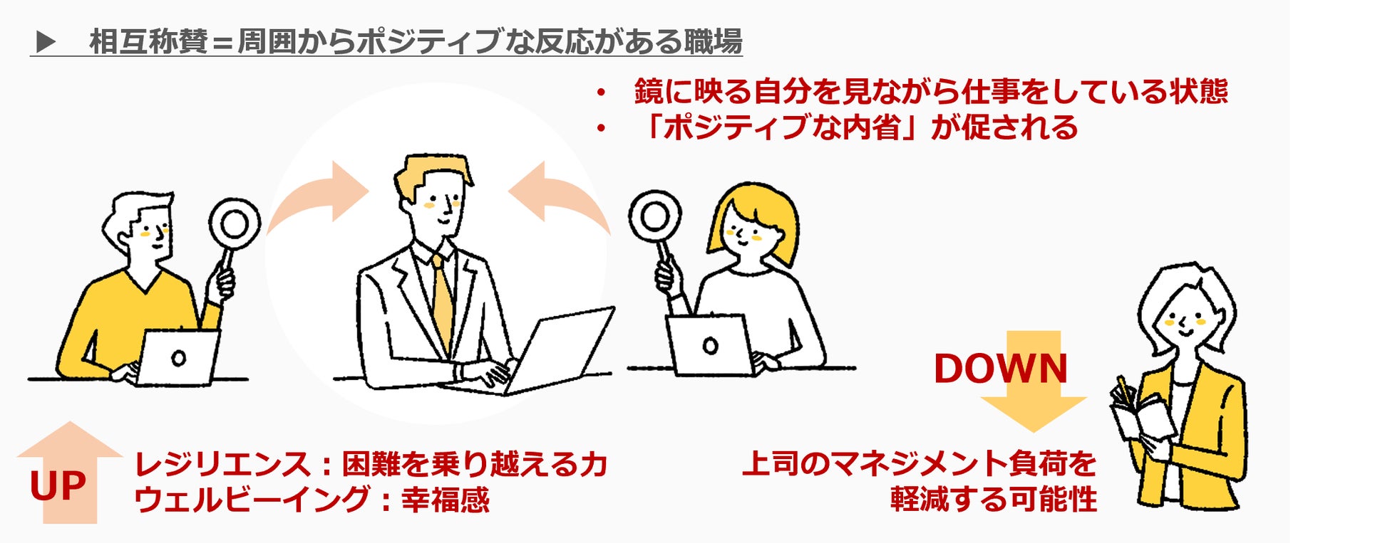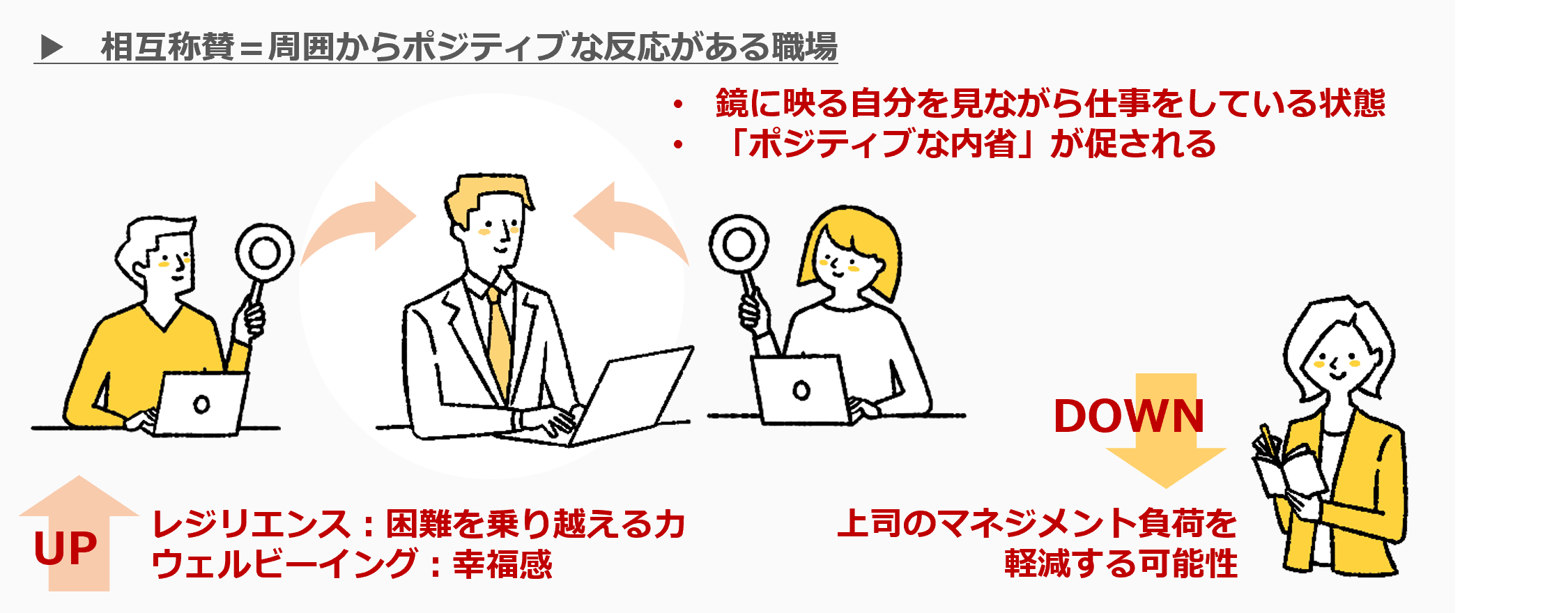 職場での相互称賛によって、部下が自ら前向きに内省する力をつければ。上司が一人ひとりに手をかける負担を軽減しつつ、変化や困難を乗り越えて成果を出し、皆がイキイキと働ける組織をつくることができるでしょう。