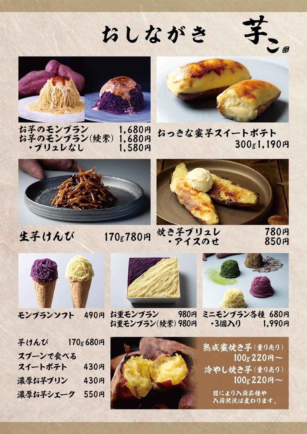 そのほか、いもこの看板商品「お芋のモンブラン」を、かわいいお土産サイズに仕立てた「ミニモンブラン」や、焼き芋に濃厚カスタードクリームを乗せてブリュレした「焼き芋ブリュレ」など常時10種類以上のさつまいもスイーツをご用意して、お客様をお待ちしております。