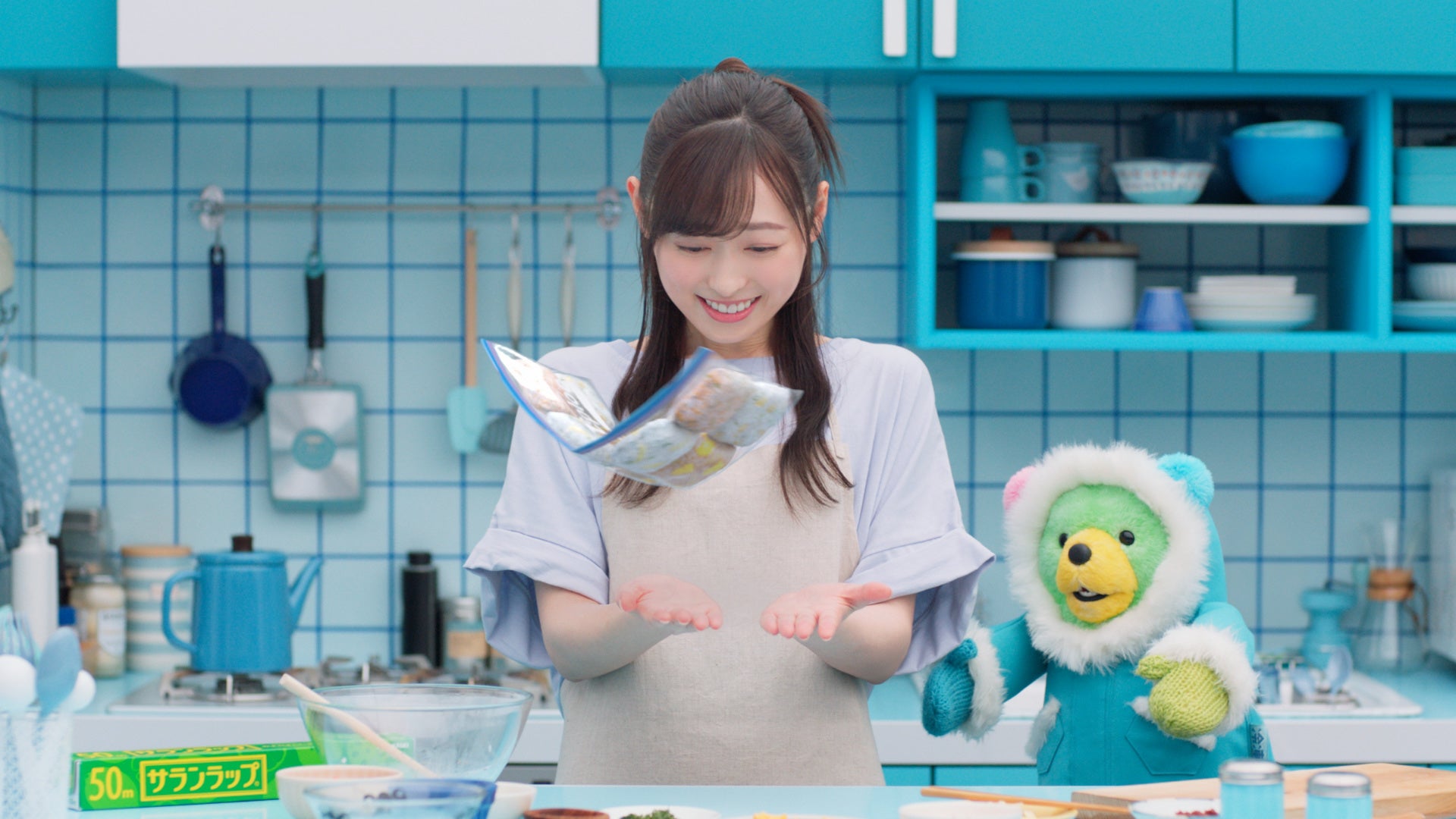 青を基調にしたかわいらしい世界観の中で、「れいちょクマ」くんのラップに合わせてノリノリで撮影させていただきました。いつもと違ったコミカルでハイテンションなところをぜひ見ていただきたいです。忙しいときでも「冷凍貯金」があるだけで簡単にごはんが作れる幸せを表現したので、伝わると嬉しいです。