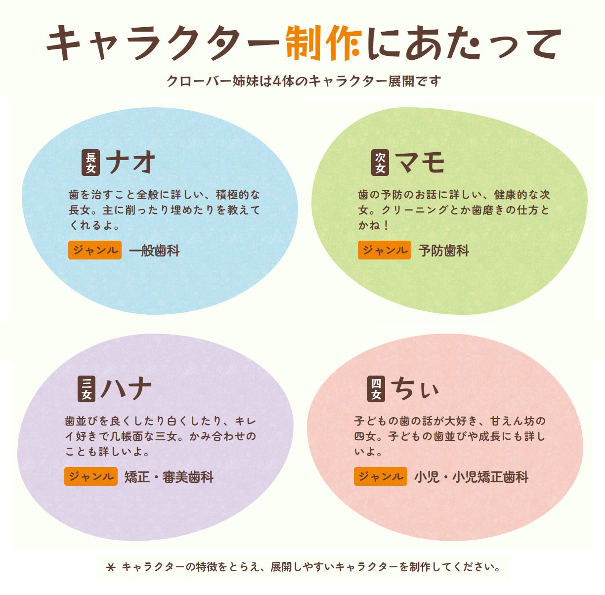今回のデザインコンテストは、当院の名前にちなんでスタッフが考えた4体のキャラクター「クローバー姉妹」のキャラクターデザインを公募するもの。プロアマを問わず、絵を描くのが好きな方、絵が得意な方、イラストレーターやデザイナーの方、デザイン専門学校や美大の学生さまなどを応募者の対象として想定しております。