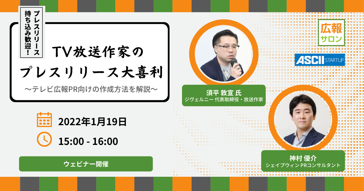 広報マーケ担当者のためのオンライン学習コミュニティ『広報サロン』を運営するシェイプウィン株式会社(東京都渋谷区)は『テレビ放送作家によるプレスリリース大喜利を開催』と題して2022年1月19日 (水)にセミナーを開催します。