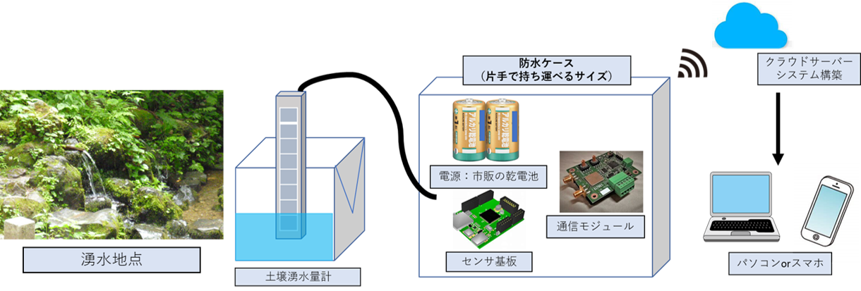 ・亀岡電子が独自開発した省電力の水位計を用いて斜面湧水量計測機器内の水位を計測することにより、湧水の流量を測る。