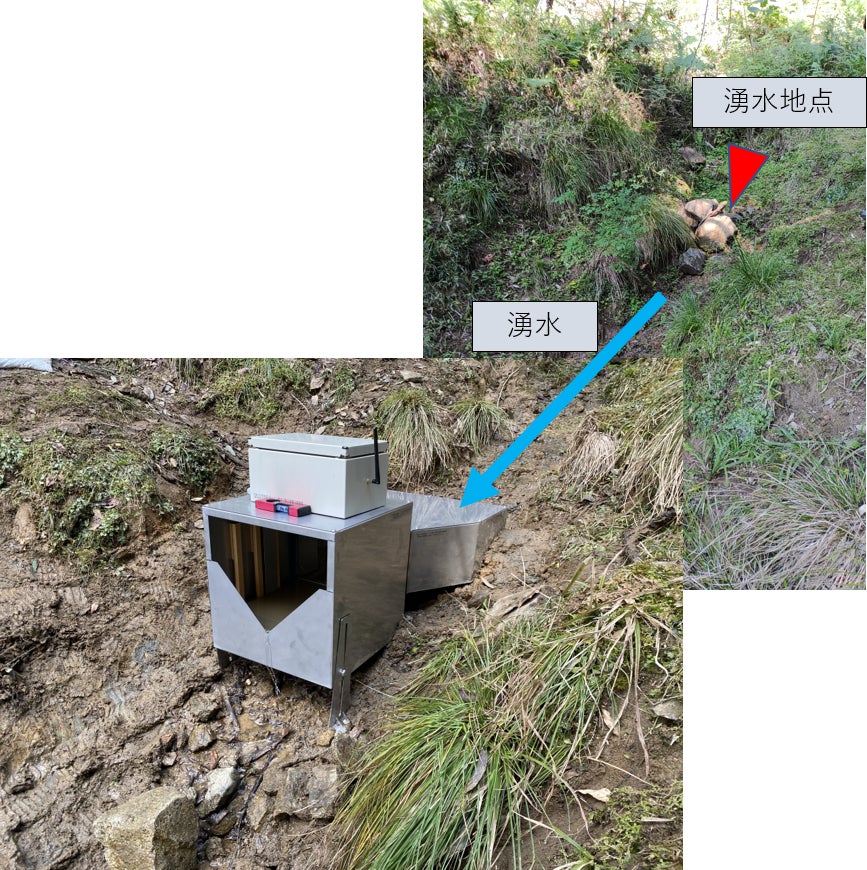 ・山の斜面にある湧水地点付近に斜面湧水量計測機器を設置する。