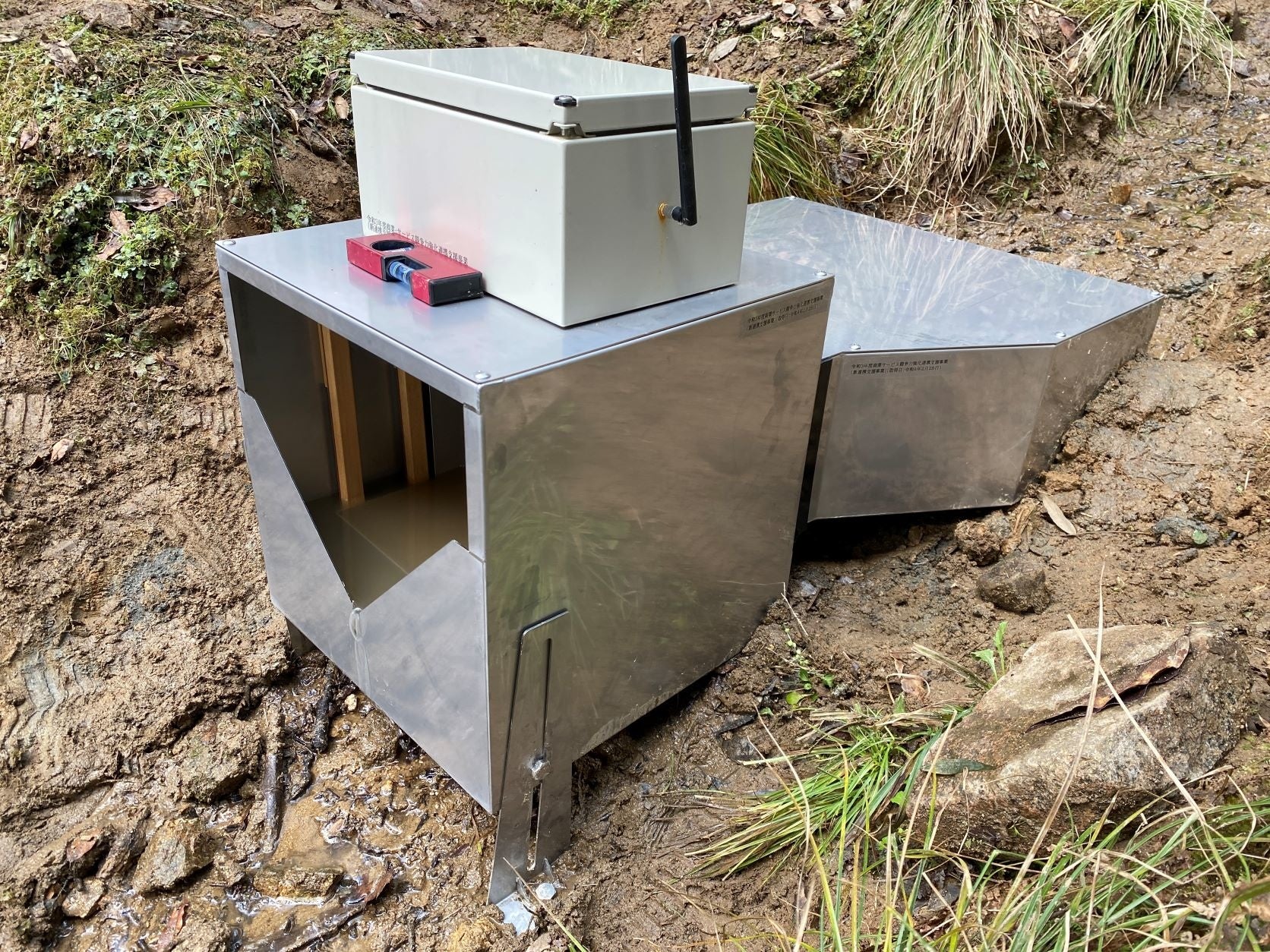 「斜面湧水量モニタリングサービス」の開発にあたって、2022年度は新たな実証実験地点を40ヶ所程度増やすことを目標としており、実証実験にご協力いただける自治体様、自治会様を募集しております。写真のような斜面湧水量計測機器を湧水地点付近に設置して常時モニタリングすることにより、2022年度内にシステム開発(見える化、アラート発報)を進めていきます。実証実験にご協力いただいた自治体様、自治会様には、実証実験中の湧水量データを共有するとともに、今後試作を開始するモニタリングシステムを、実証実験期間中無償でご利用いただく予定です。