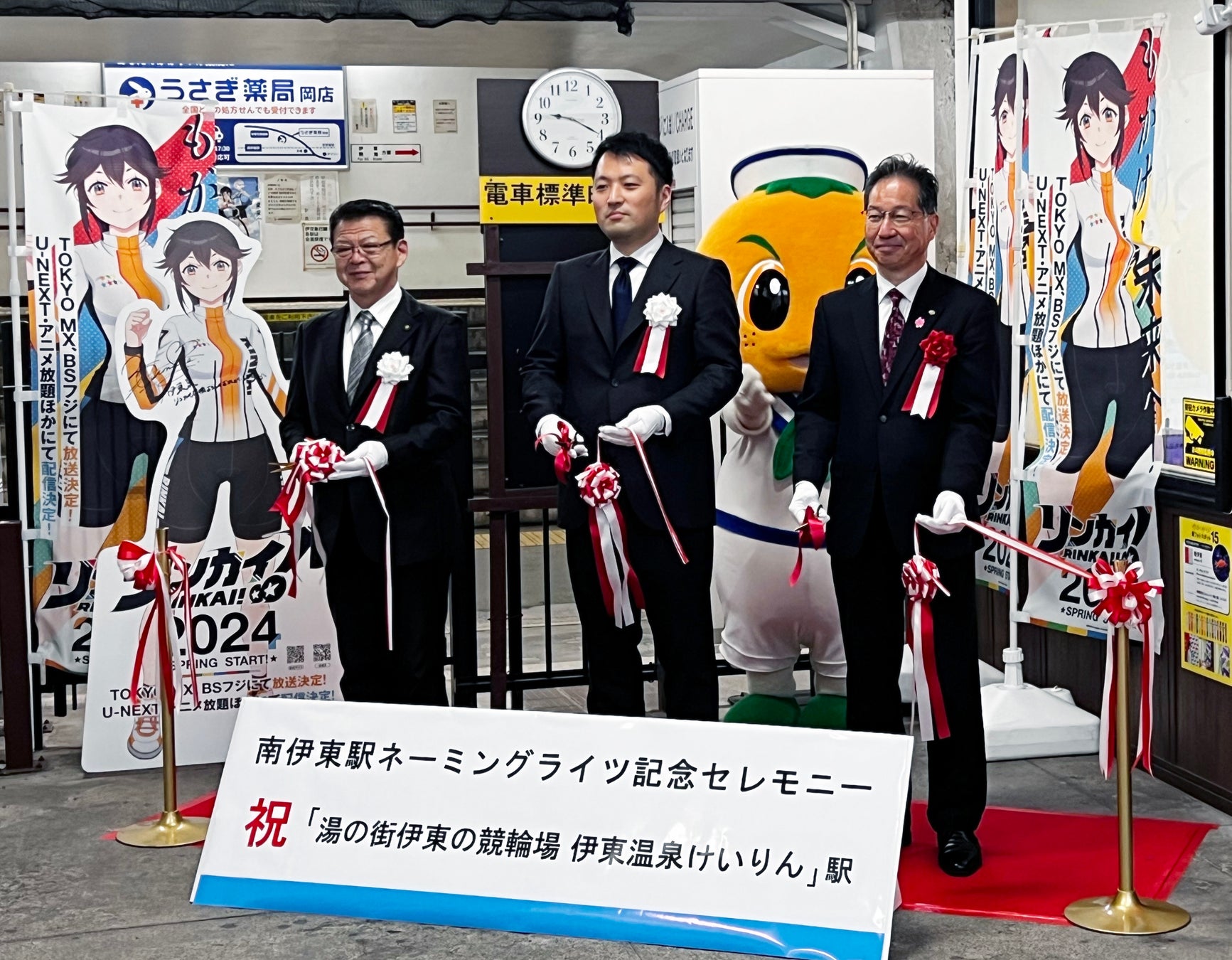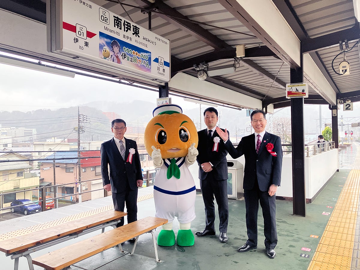 本締結に伴い、2025年3月3日(月)に南伊東駅でセレモニーが開催されました。セレモニーには、伊東市長 小野達也氏、伊豆急行株式会社 取締役社長 土方健司氏、当社代表取締役 石原洋輔が出席し、各出席者による挨拶とテープカットが行われました。