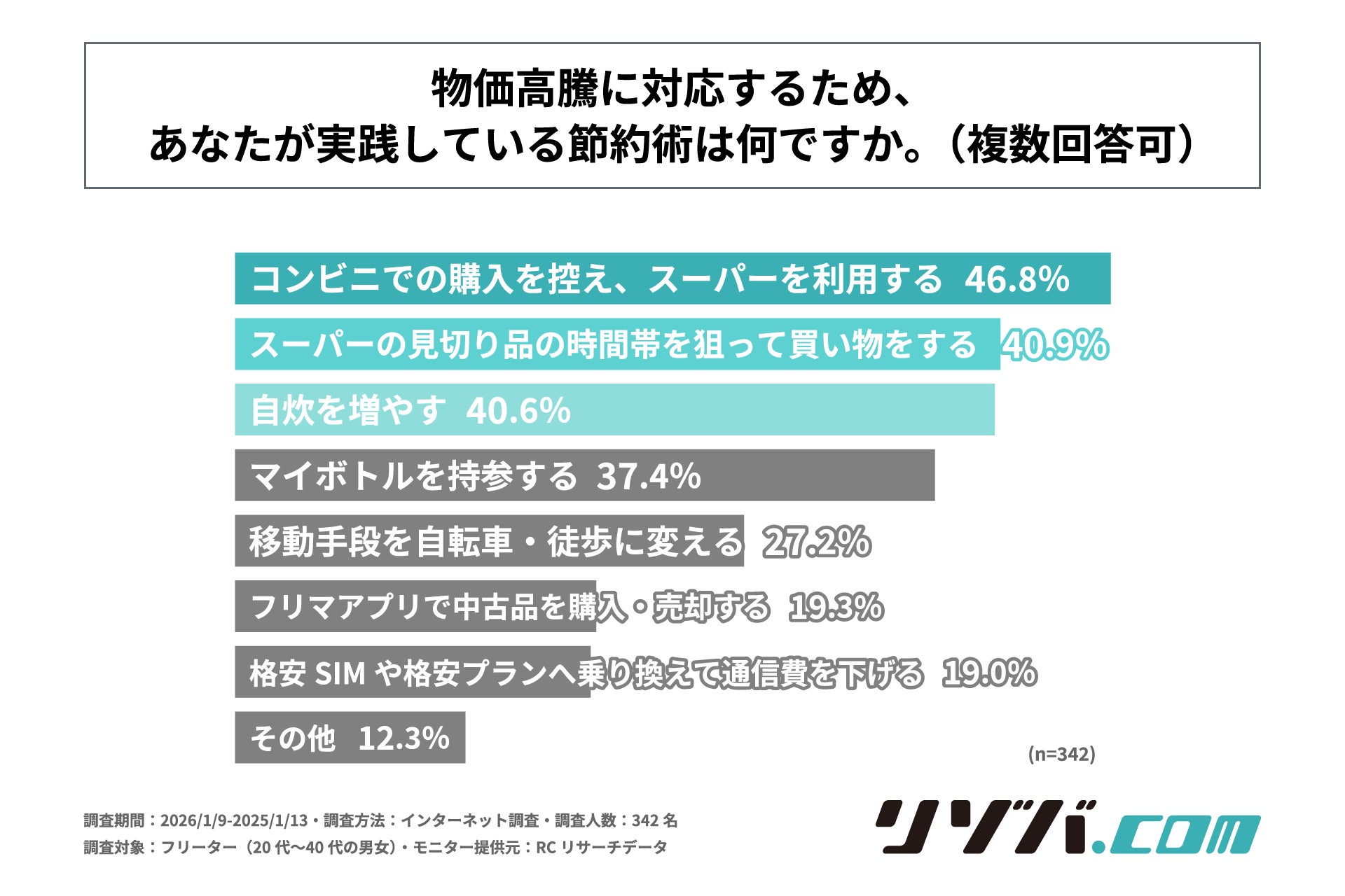 また、「物価高騰に対応するため、自身が実践している節約術は何か」を尋ねる設問への回答では、1位が「コンビニでの購入を控え、スーパーを利用する」で46.8%、2位が「スーパーの見切り品の時間帯を狙って買い物をする」で40.9%、3位が「自炊を増やす」で40.6%という結果になりました。この結果から、多くのフリーターが実践している主な節約術は、コンビニでの購入を控えてスーパーを利用することや、スーパーで見切り品を狙うことに加え、自炊を増やすといった食費を抑えるための工夫であることが判明しました。