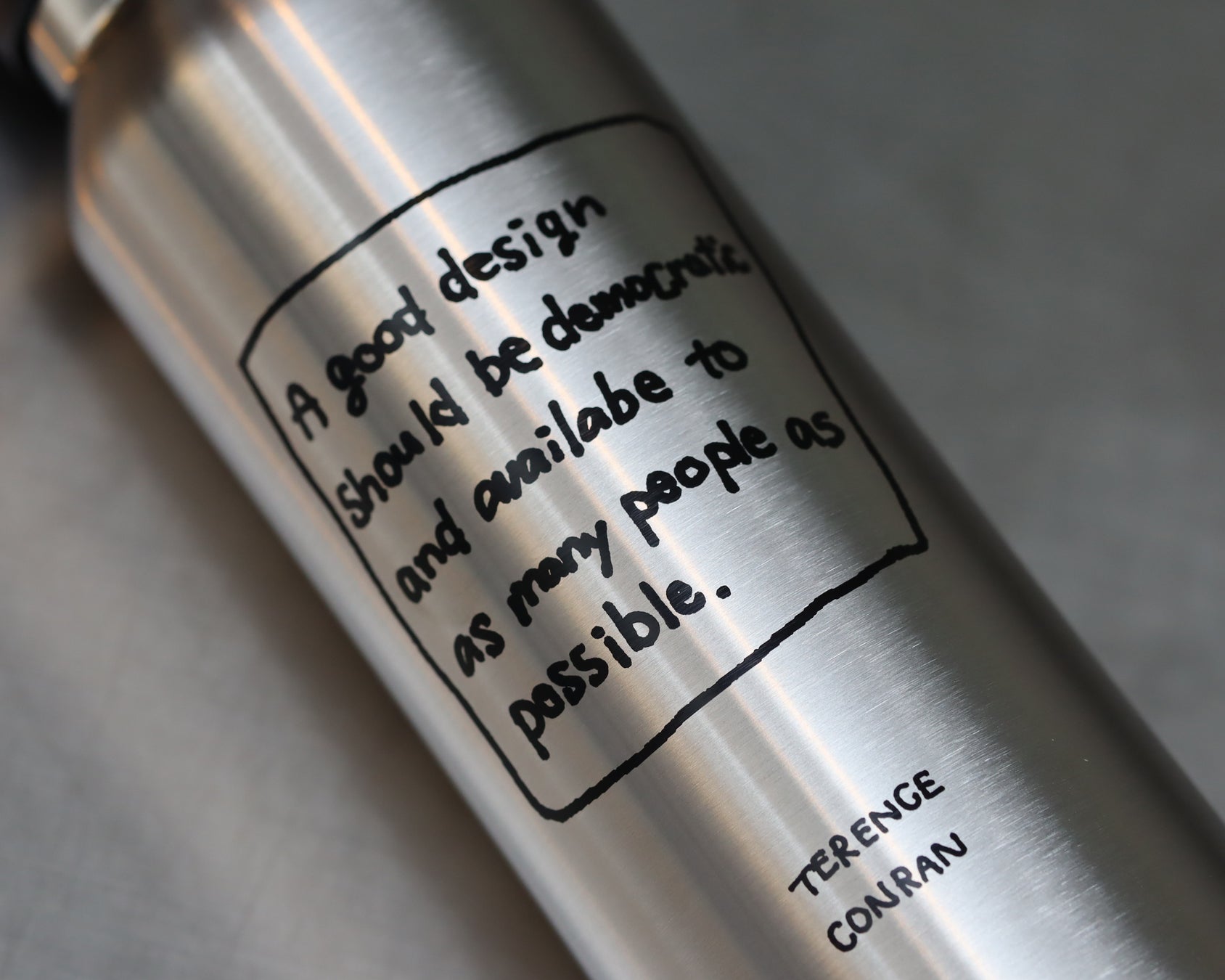 イラストレーターのsayurinishikuboによる今回の展覧会用に描いてもらったデザインをプリント。メッセージは、デザイナーでもあったテレンス・コンラン本人が大切にしていた「デザインを通して社会をより良くしたい」というモットーが伺える実際のコメントです。