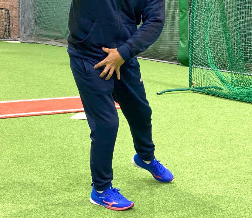つま先が外側に向いていると 軸足に体重は乗せやすいですが、これでは完全に力が逃げてしまいます。八の字のスタンスだと腰の回転が弱く、結果、軸足側の踵があがってこない原因にもなります。