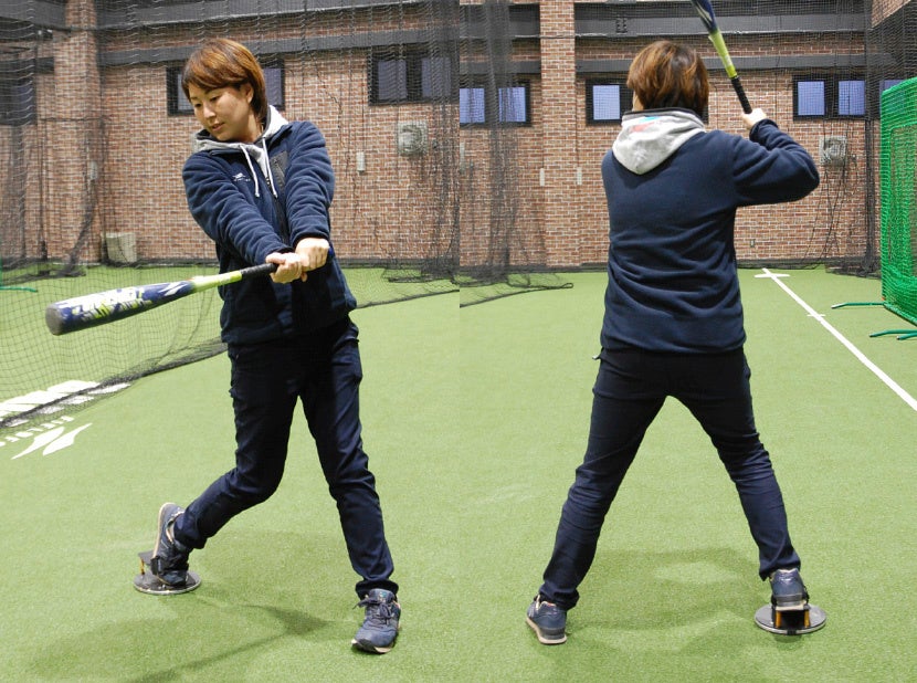 「軸足に体重をのせ、力強いスウィングで打球を飛ばす」