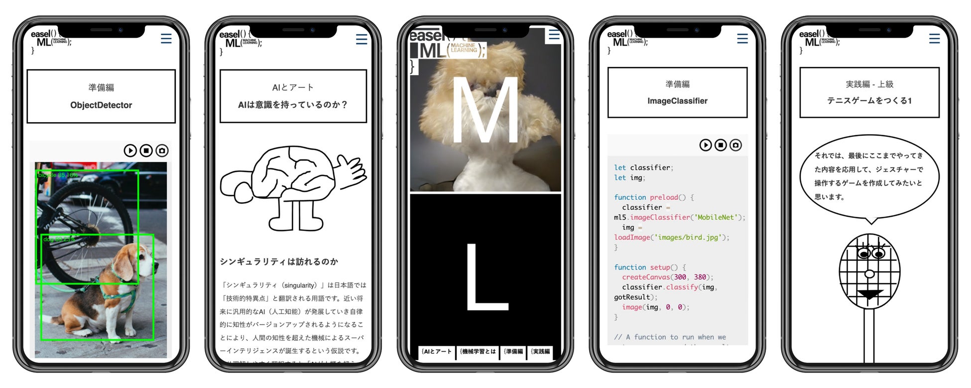 「easel ML」は、AIや機械学習について、“正しく理解”することで、⼈と機械の理想的な関係を考えるきっかけを与え るオンラインプログラミング教材です。監修はクリエイティブコーダーの⽥所淳(前橋⼯科⼤学准教授、東京藝術⼤学⾮ 常勤講師・慶應義塾⼤学⾮常勤講師)。アートワークは平⼭昌尚が作成。機械学習を簡単に学ぶことができるライブラリ である「ml5.js」を使⽤。機械学習の訓練済みモデルを使ったり簡単なゲームを作って、プログラムを動かしてみること で、機械学習とはどのようなものか簡単に学ぶことができます。