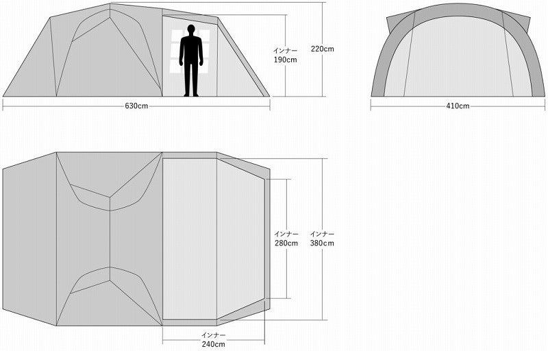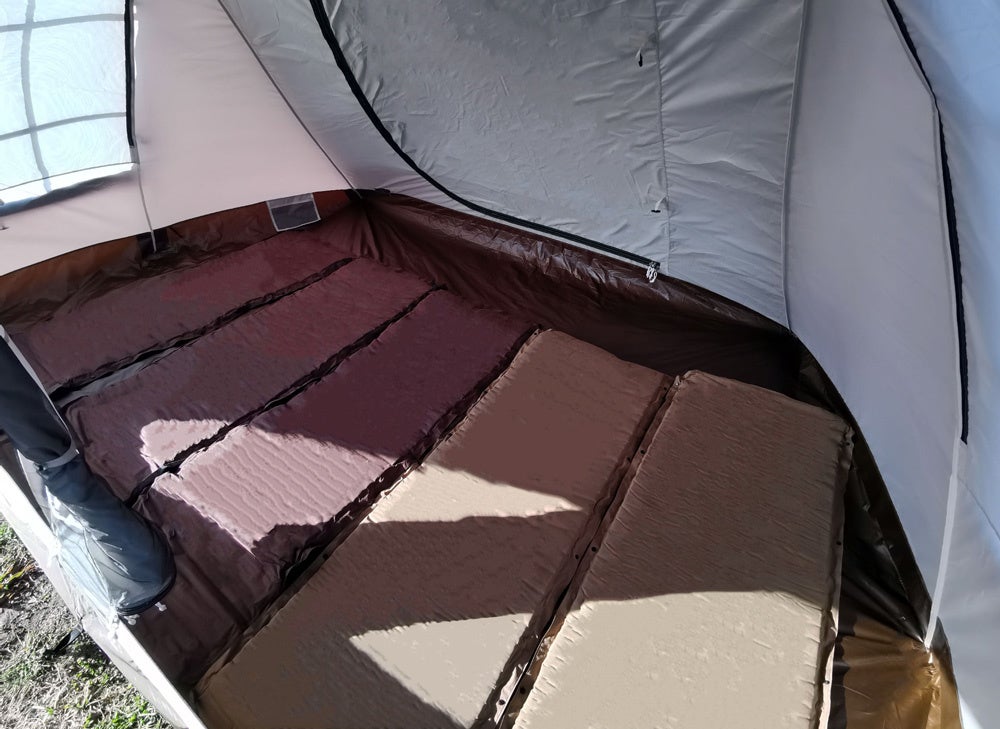 高さ180cm以上あるので、インナー内での着替えもラクラク。また、足元にも荷物を置けるスペースを確保しながら、大人5人が寝ることができる広さです。ファミリーなら大人2人と子供4人が一緒に寝ることができます。