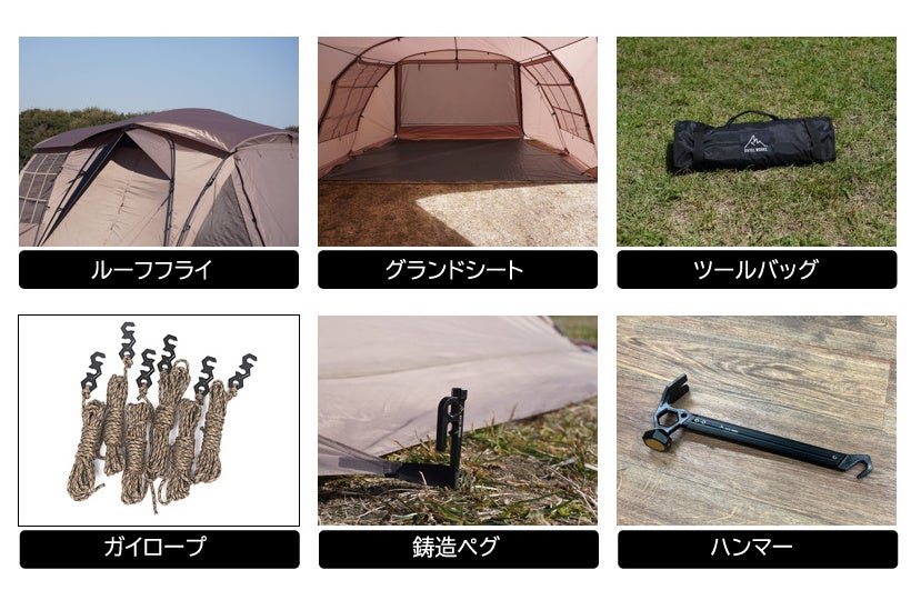インナーテントが付属することはもちろん、ルーフフライ、グランドシート、ツールバッグ、ガイロープ、鋳造ペグ、ハンマーが標準で付属しています。キャノピーポールも2本標準装備です。