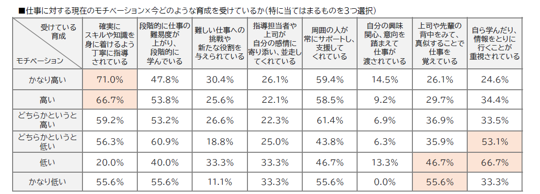 一方で、「上司や先輩 の背中をみて、真似することで仕事を覚えている」、「自ら学んだり、情報をとりに行くことが重視されている」と感じている新入社員は、モチベーションが低い傾向にあることがわかりました。