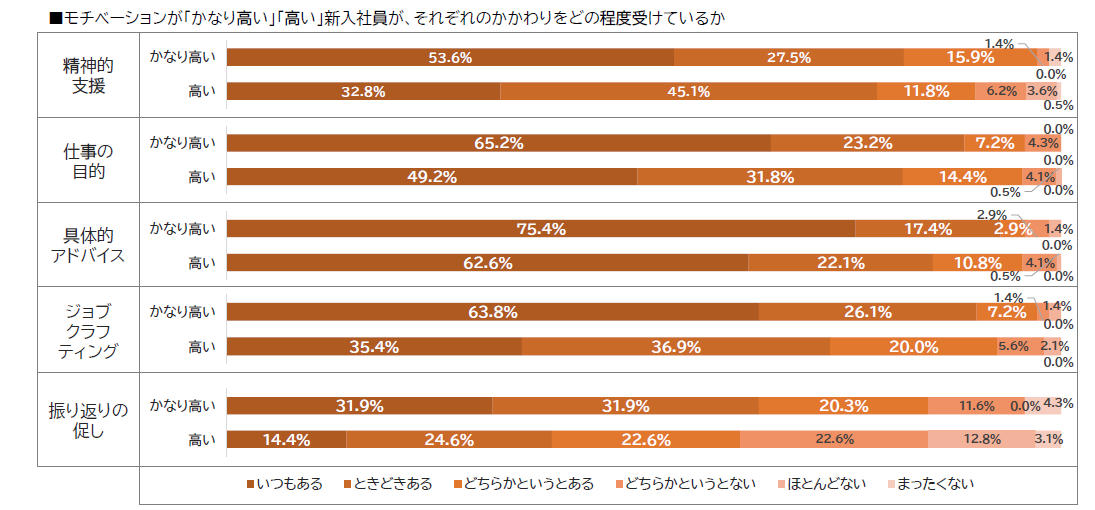 また、モチベーションが「かなり高い」「高い」新入社員は、全体的に上司・先輩とのかかわりの量が多く、特に具体的なアドバイスを受けていることがわかりました。