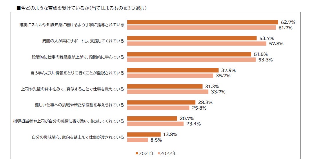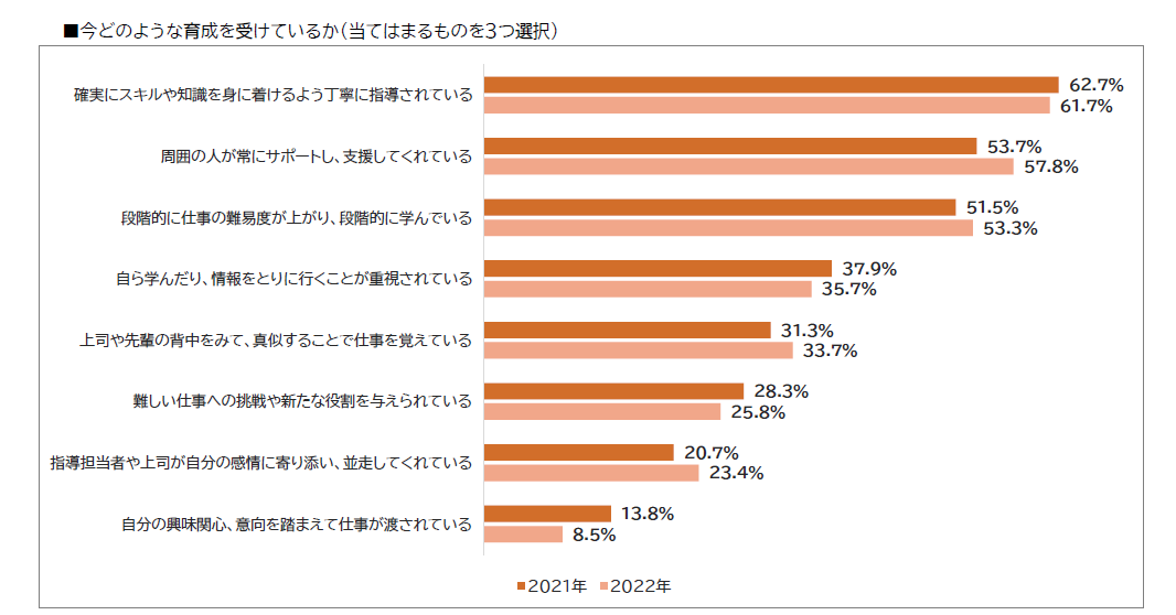 今どのような育成を受けているか(当てはまるものを3つ選択)という項目において、「自分の興味関心、意向を踏まえて仕事が渡されている」を除いて、2021年の数値と比較した際の増減は 5%以内という結果であり、2021年から2022年の1年間で職場の育成環境は大きく変わっていないと言えます。