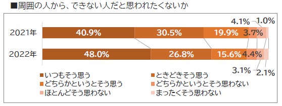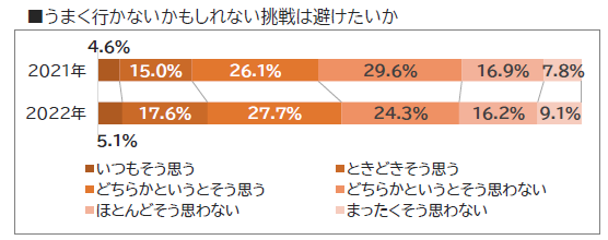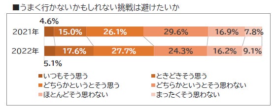 「うまく行かないかもしれない挑戦は避けたいか」、「 周囲の人から、できない人だと思われたくないか」という項目について 、 2021年と比較して 「いつもそう思う 」、「 ときどきそう思う」と回答した新入社員が増加しました。