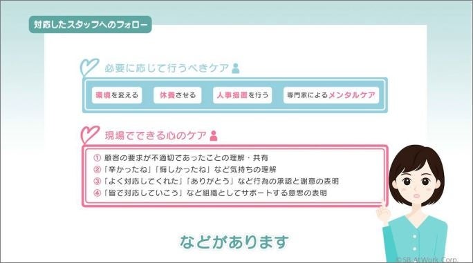 今回追加したハラスメント対策のコンテンツの「カスタマーハラスメントとは何か~正しい理解と対処方法~」は、カスタマーハラスメントを未然に防ぐためにハラスメントの理解を深め、カスタマーハラスメントが起こった場合の対処法だけでなく、対応したスタッフに対するケアの方法まで学べる内容になっています。