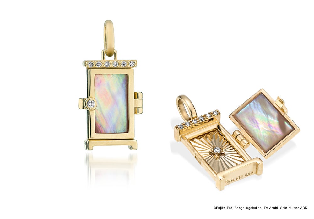 お馴染みのひみつ道具“どこでもドア”をK18イエローゴールドで象りダイヤモンドをあしらったリュクスなチャーム。天然のピンクマザーオブパールの扉を開くと、放射状に輝くテクスチャーで囲まれたダイヤモンドの星が現れる仕様。華やかでジュエリーライクに仕上げながらも、クラフトマンシップが光る造りで大人の遊び心を擽ります。
