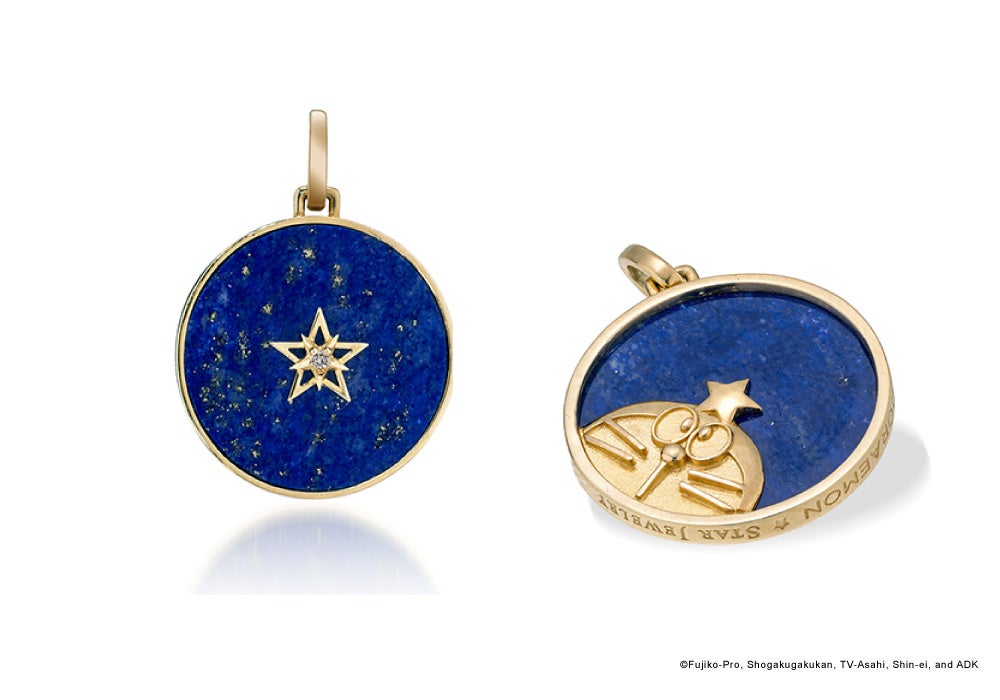 表面には、ゴールドの自然の斑が美しいラピスラズリを夜空に見立て、立体的なスターモチーフにダイヤモンドをセッティング。裏面は、まるで星に願いを込めているかのような様子のドラえもんの顔が覗く、愛らしいデザインです。