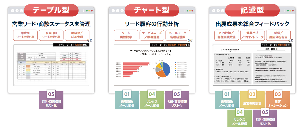 取得データをチャート化したサマリーレポートを基に、【追客支援】【マーケティング戦略分析】【出展課題分析】など、あらゆる業務プロセスでご活用いただけます。
