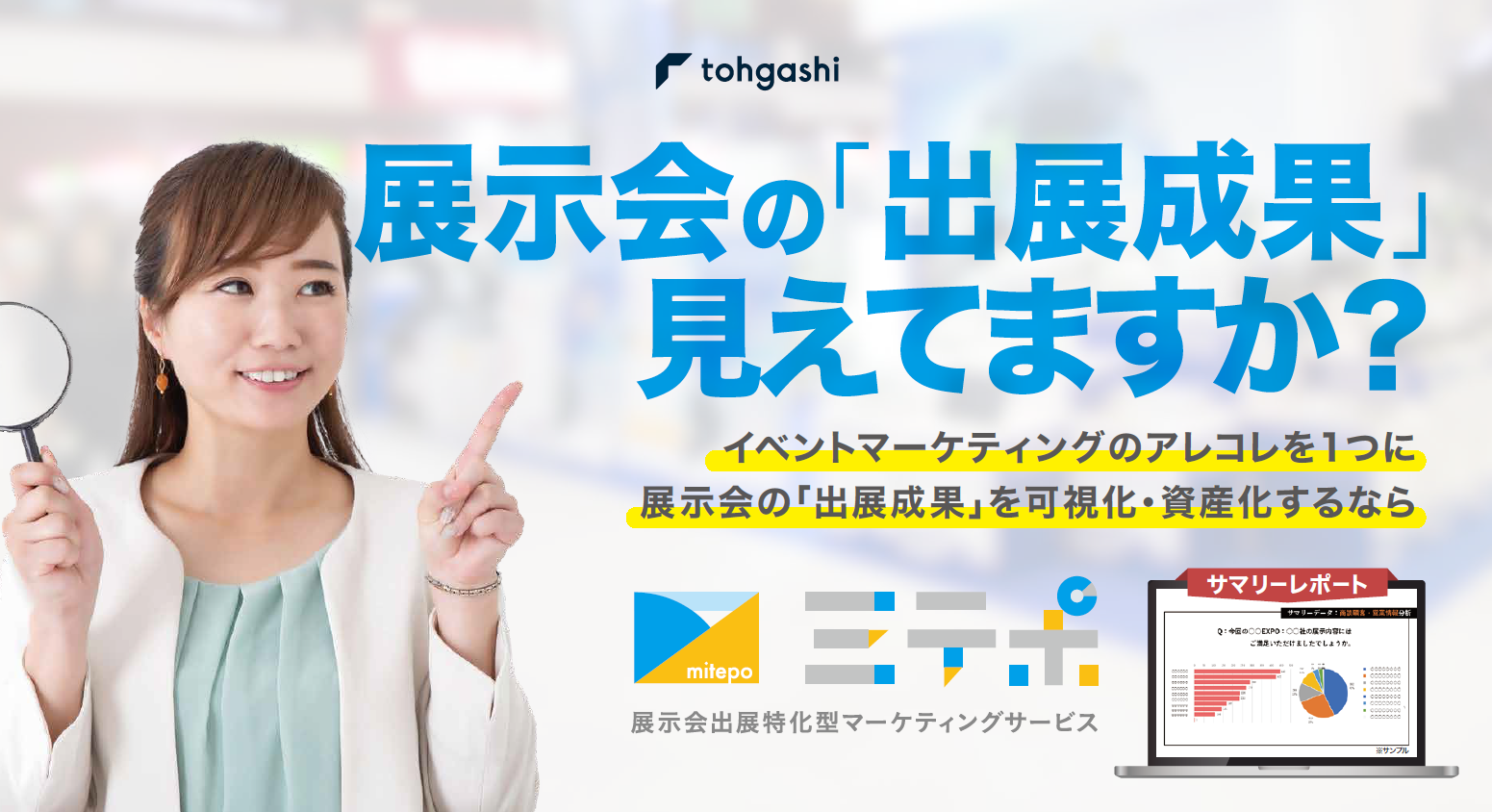 「イベントの未来を科学する」をスローガンに掲げ、イベントの総合プロデュース事業を展開する株式会社トーガシ(本社:東京都江戸川区、代表取締役 吉田守克)は、6月21日(火)に展示会出展特化型マーケティング代行サービス「ミテポ」をリリースいたします。