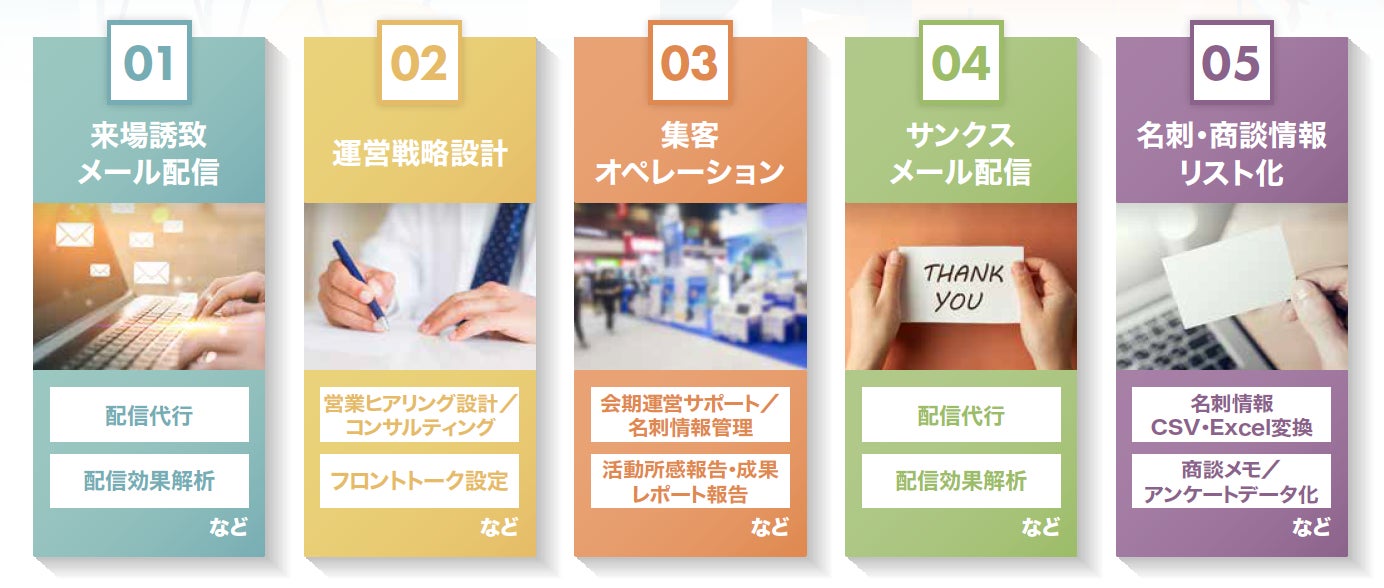 会期前から会期後までの一連のイベントマーケティング業務をワンストップでアウトソースできるサービスです。納品レポートは出展後のリードへの追客資料としてもそのまま活用が可能、出展後の業務負担まで軽減いたします。