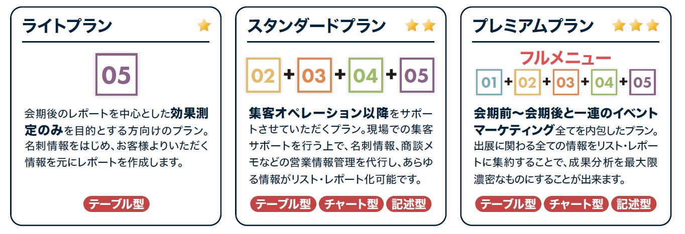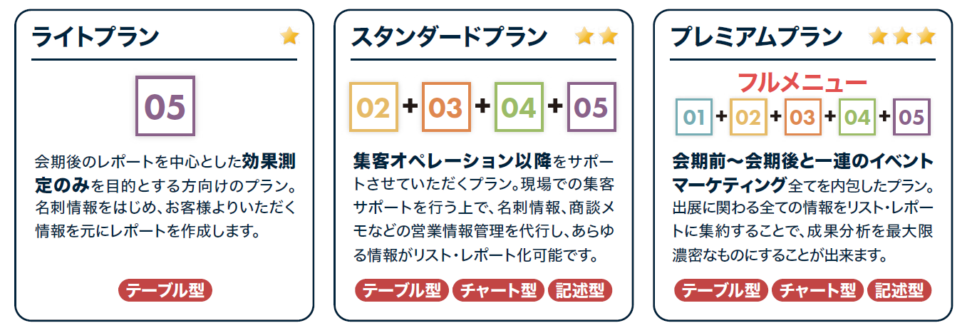 お客様の出展遍歴を共に振り返りながら業務ヒアリングを行い、ご出展の目的・課題を再定義した上でプランをご提案させていただきます。 会期前から会期後まで一連のイベントマーケティングをパッケージした「プレミアムプラン」から会期後のレポートを中心とした効果測定のみの「ライトプラン」まで、お客様の目的・ご予算に合わせてのプラン選択が可能です。