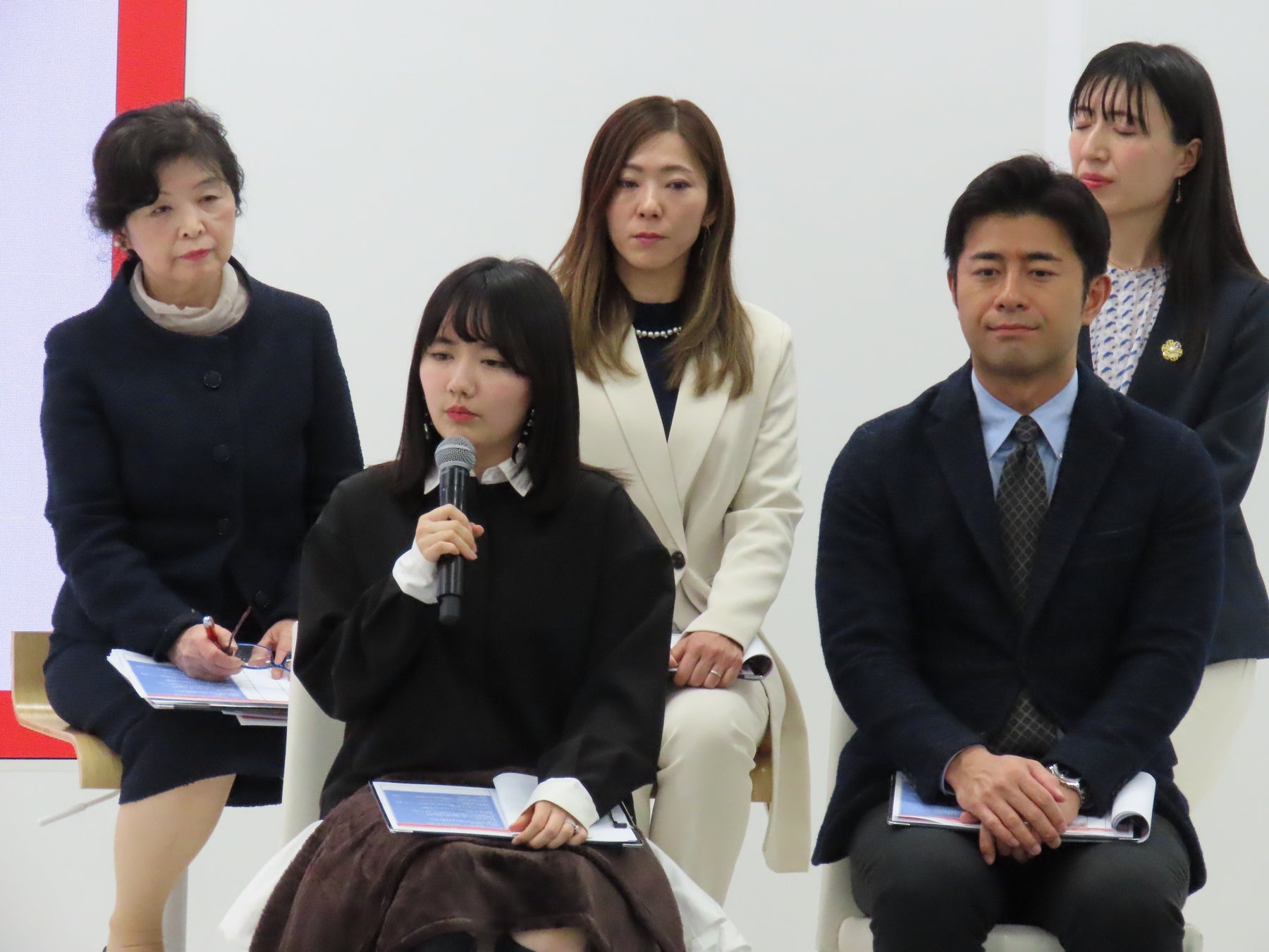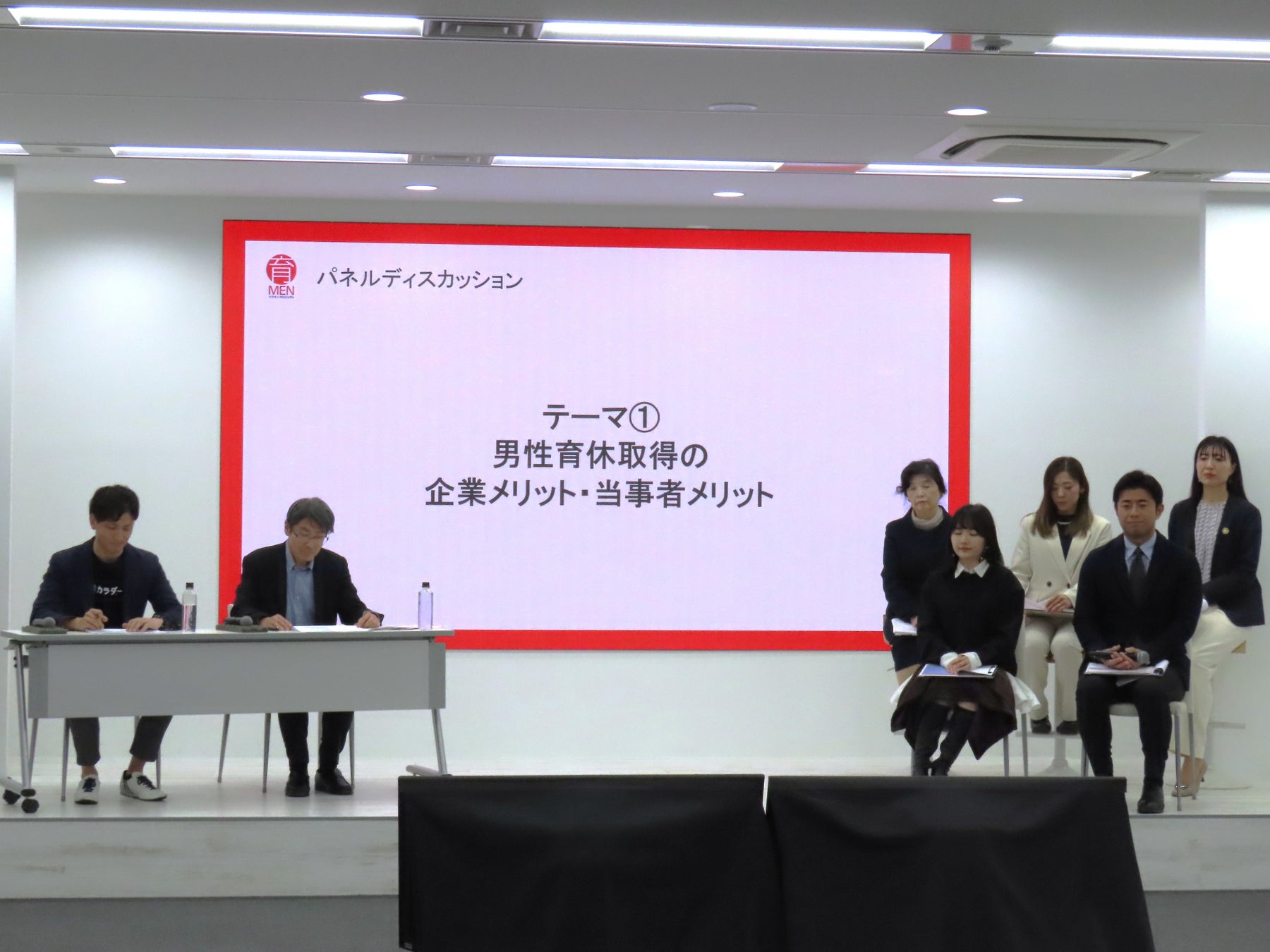 パネルディスカッションにおいては、実際に育休を取得したアナウンサー榎並大二郎氏及び若年層に影響力のあるインフルエンサー椎木里佳氏が登壇し、イクメンプロジェクト推進委員である全国中小企業団体中央会常務理事及川氏、株式会社カラダノート佐藤氏とともに、男性育休を当たり前にするためのポイント・ヒントを探るため、「男性育休取得の企業メリット・当事者メリット」など様々なテーマでパネルディスカッションを行いました。