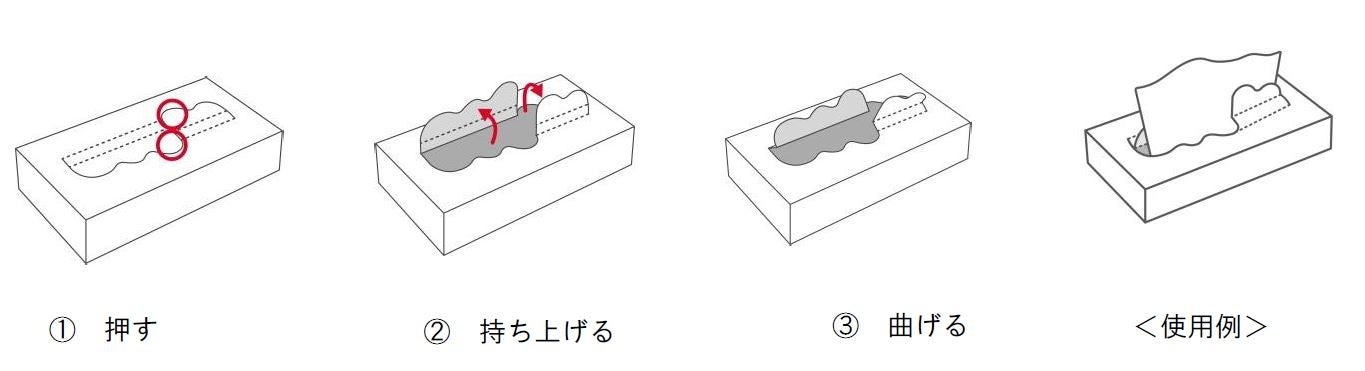 使い始めは、取り出し口部分を押すだけで簡単に開く「押すだけカンタン取り出し口」を新採用。また、使用途中で取り出しづらくなった場合は、ボックスを持ったまま底を押しあげることで、取り出しやすくなります。