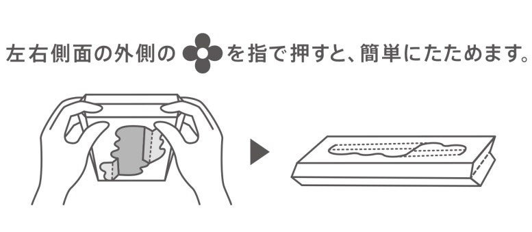 使用後は、「押すだけタタミジョーズ」を採用。箱を押すだけでたたむことができるので、簡単に“紙”としてリサイクルできます(ゴミの分別は自治体の区分にしたがってください)。包装材への印刷には、植物由来の原料を使用した、バイオマスインキを採用しています。