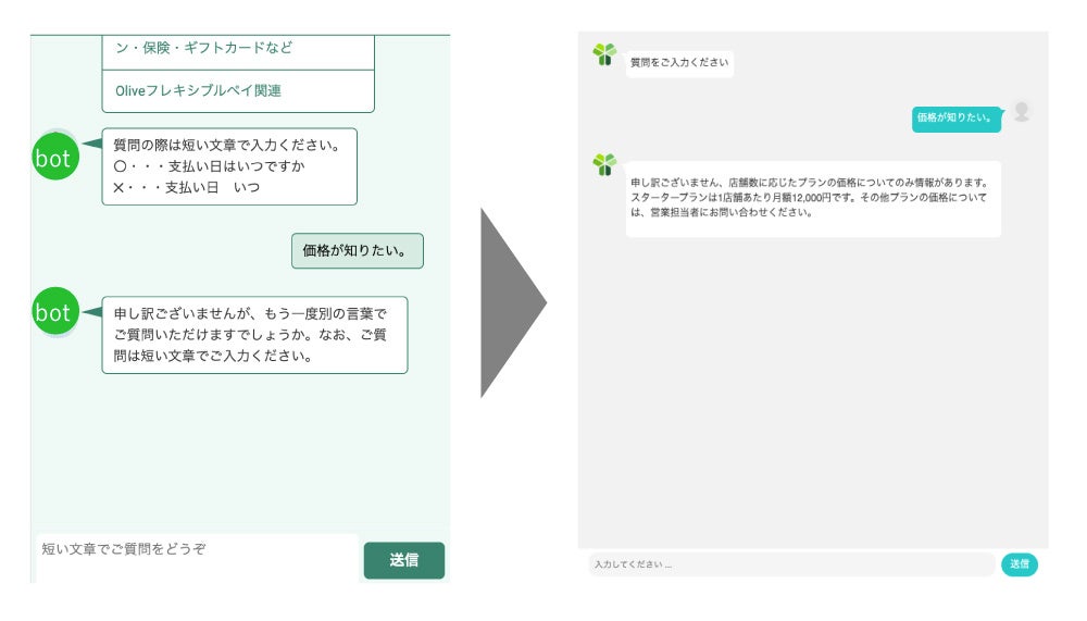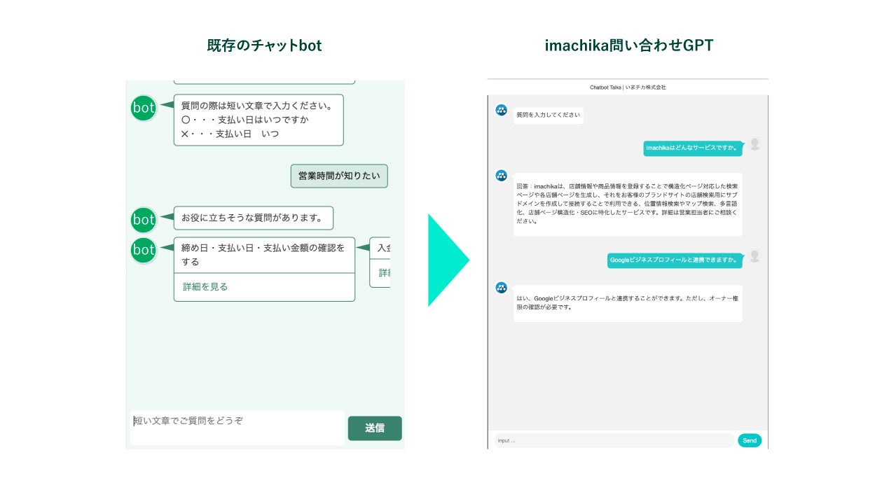 →今までのチャットボットは、事前登録した内容と少しでも文言が異なると回答できませんでした。imachika AI Chat なら、登録内容と合致していなくても文章が生成されます。